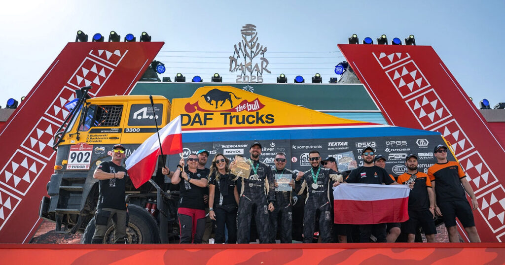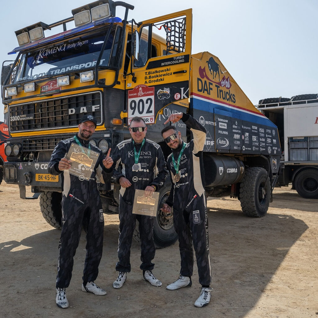 Tomasz Białkowski (kierowca), Dariusz Baśkiewicz (nawigator) i Adam Grodzki (mechanik), startujący legendarnym DAF 3300, wygrali Rajd Dakar Classic 2026 w klasyfikacji ciężarówek. Załoga Kamena Rally Team uplasowała się na 9. miejscu. 40-letni DAF 330 to jedyna ciężarówka w czołowej dziesiątce wśród wszystkich uczestników.