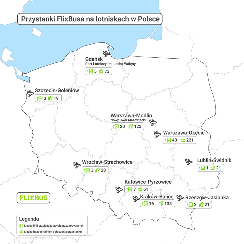 W Polsce FlixBus dysponuje siecią połączeń lotniskowych, która pozwala podróżnym w łatwy sposób zaplanować dojazd na swój lot. Aktualnie obejmuje ona regularne oraz sezonowe linii, którymi można dotrzeć do 9 portów lotniczych w Polsce. Przewoźnik obsługuje oba warszawskie lotniska i oferuje połączenia z wielu miast w kraju oraz wybranych kierunków zagranicznych. FlixBus zapewnia również dostęp do portów lotniczych w Gdańsku, Szczecinie, Krakowie, Katowicach, Wrocławiu czy Rzeszowie. Dodatkowo w siatce połączeń znajdują się bezpośrednie trasy między lotniskami, co pozwala na sprawne przemieszczanie się pomiędzy portami lotniczymi. Z Polski można także bezpośrednio dojechać autobusami FlixBusa do wybranych zagranicznych lotnisk.