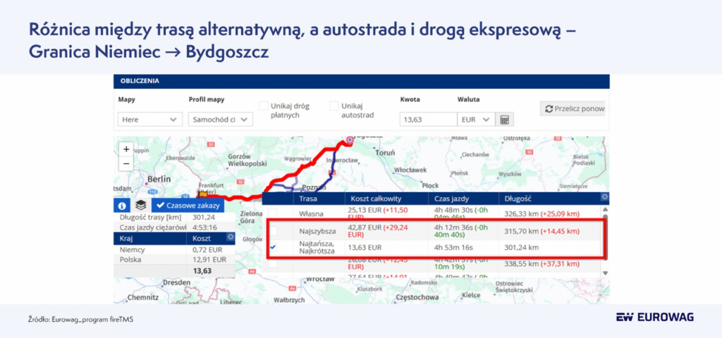 Rosnące koszty autostrad i dróg ekspresowych mogą skłaniać przewoźników do powrotu na drogi krajowe. Na przykład wyliczenia z systemu fireTMS dla trasy z Bydgoszczy do zachodniej, niemieckiej granicy państwa pokazują, że zamiast autostrady można wybrać tańszą do niej alternatywę (drogę 92) i wtedy zaoszczędzić prawie 30 euro (ok. 125 zł w jedną stronę). Przy regularnych przejazdach są to realne korzyści finansowe dla firm.
