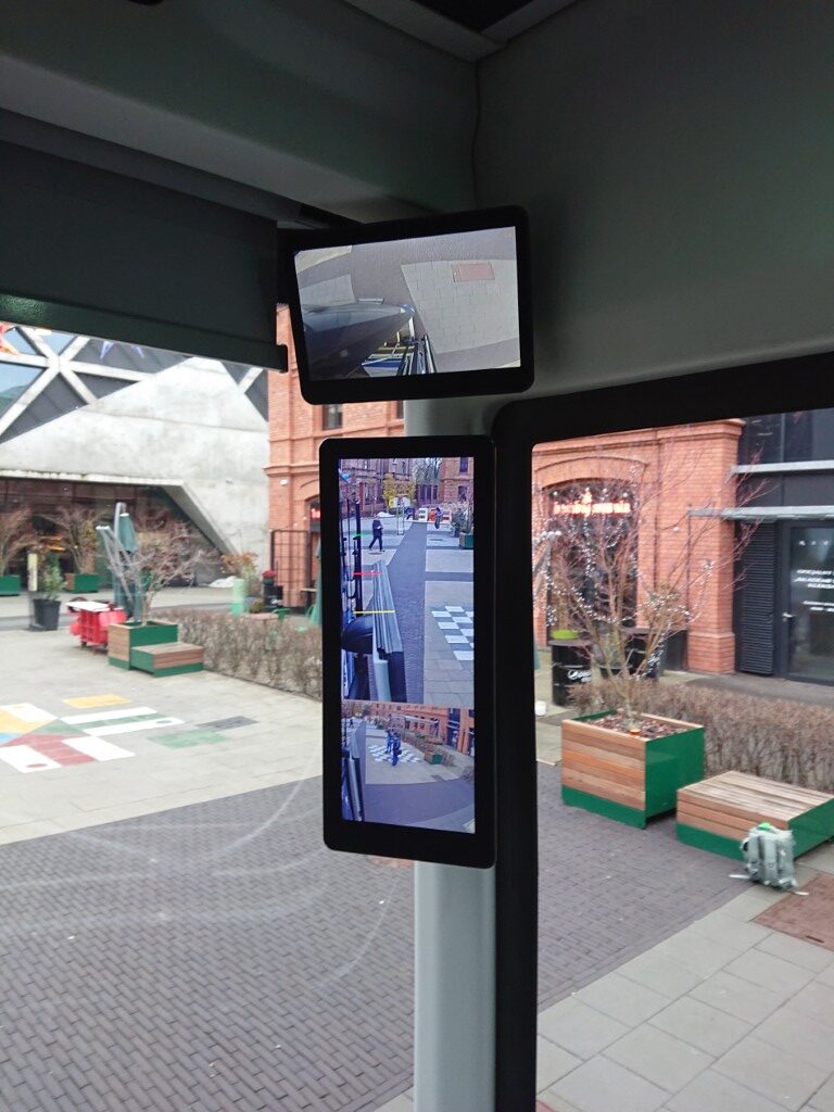 Kierowca ma przed sobą wygodny kokpit z trzema ekranami. Środkowy zajmują cyfrowe wskaźniki, prawy służy do obsługi inforozrywki, a lewy pokazuje obraz z kamer monitorujących wnętrze i obszar wokół autobusu. Wśród ich funkcji jest panoramiczny widok w promieniu 360 stopni wokół autobusu. Producent przewidział zastosowanie cyfrowych lusterek, ale na życzenie nabywcy można zamontować zwykłe.