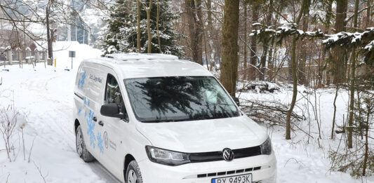 Volkswagen Caddy Cargo Maxi z zabudową chłodniczą i kompaktowym agregatem. Jego niewielkie gabaryty są atutem na ciasnych ulicach miejskich.