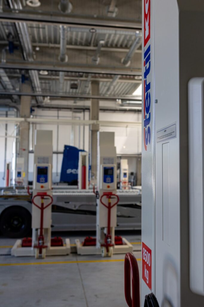 Mamy również Centrum Napraw Powypadkowych. To osobne stanowisko do kompleksowych napraw pojazdów. Ma najnowocześniejszy sprzęt do prac blacharskich i prostowania ram, w tym kratownicę, co umożliwia naprawę ciężarówek, naczep i autobusów. Cały warsztat jest bezkanałowy, z wyjątkiem jednego stanowiska olejowego, które wyposażono w najnowocześniejszą ścieżkę diagnostyczną do kontroli pojazdów. Praca odbywa się na 16 podnośnikach kolumnowych, każdy o udźwigu 8,5 tony. Dzięki temu jest bezpieczniejsza i wygodniejsza – mówi Tomasz Krasiński. – Oferujemy klientom również legalizację tachografów oraz przeglądy UDT zbiorników gazowych LNG.