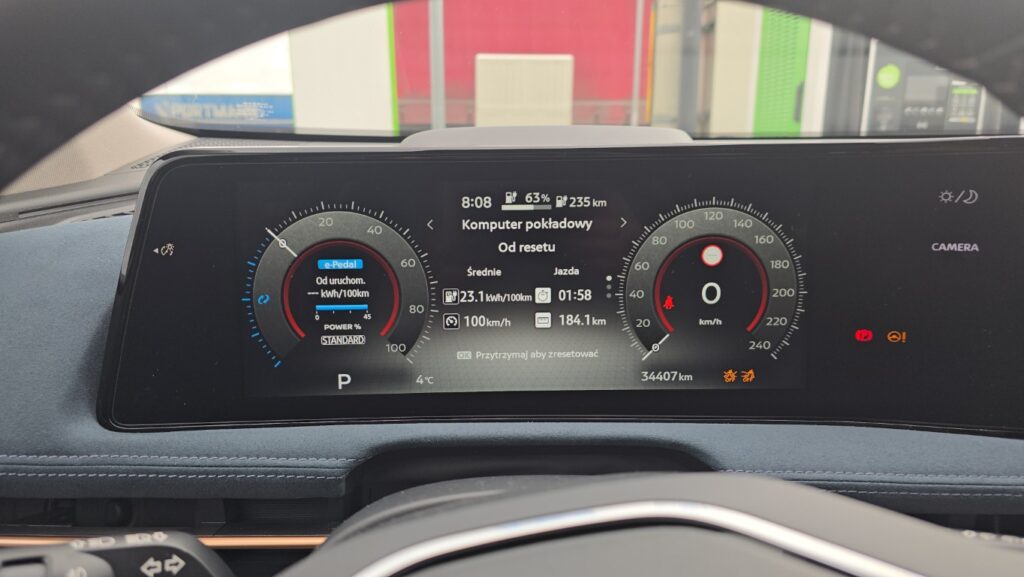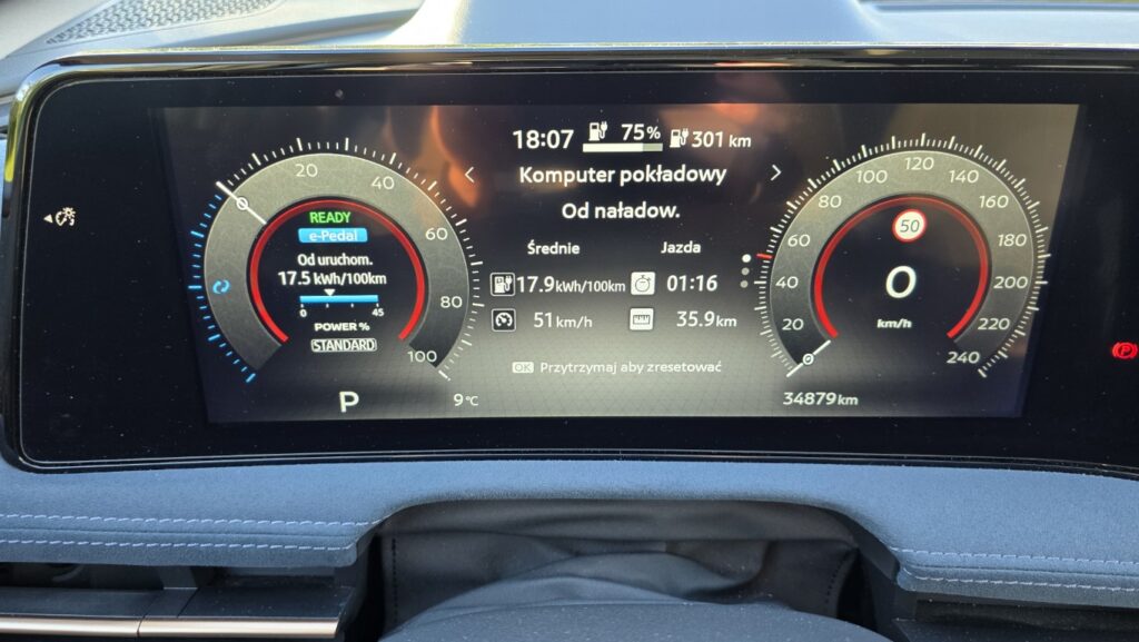 A co ze zużyciem energii? Podczas jazdy miejskiej, w warunkach weekendowych, bez korków oscylowało wokół 18–19 kWh/100 km. W trasie przy prędkościach 90–100 km/h zużycie wzrosło do około 20–21 kWh/100 km. Przy zwiększonej prędkości do około 120–130 km/h zużycie rośnie do około 23,5 kWh/100 km. Przy prędkości 140 km/h zużycie energii może wzrosnąć nawet do około 26 kWh/100 km. Jadąc ze średnią prędkością 75 km/h i podczas trasy mieszanej średnie zużycie energii wyniosło 22 kWh/100 km.