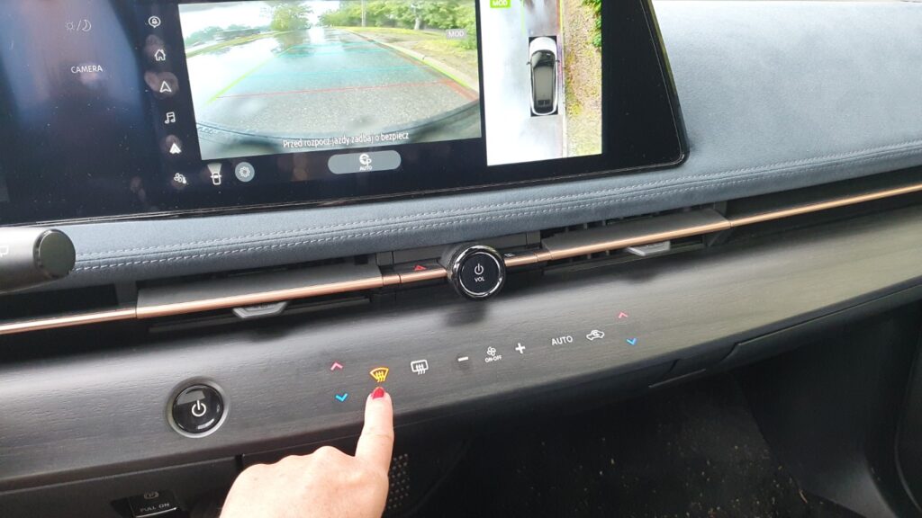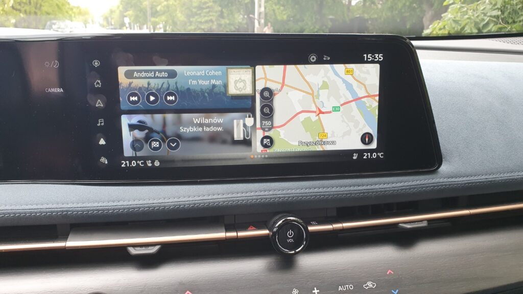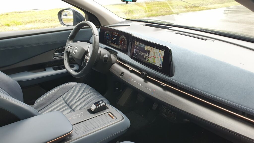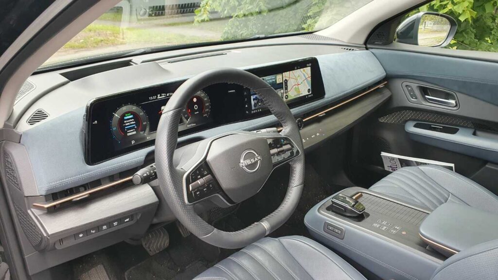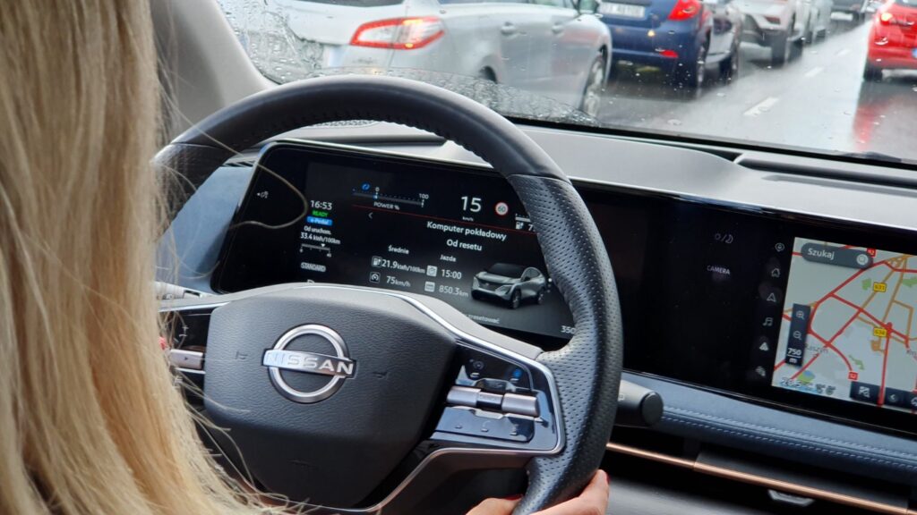 Na tablicy rozdzielczej zamontowano dwa 12,3-calowe zintegrowane ekrany dotykowe. Tworzą one panoramiczny kokpit. Za ich pomocą mamy dostęp do najistotniejszych systemu multimedialnego oraz parametrów jazdy. Nissan zastosował w tym wypadku dotykowe przyciski haptyczne. Robią bardzo dobre wrażenie, ale korzystanie z nich wymaga przećwiczenia i przyzwyczajenia.