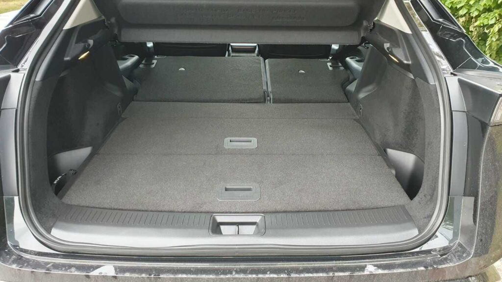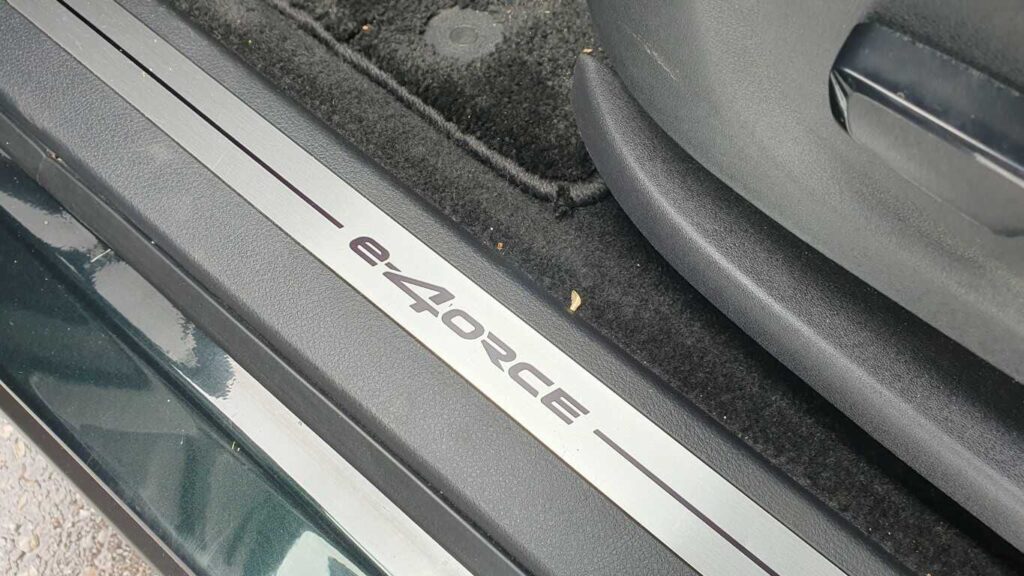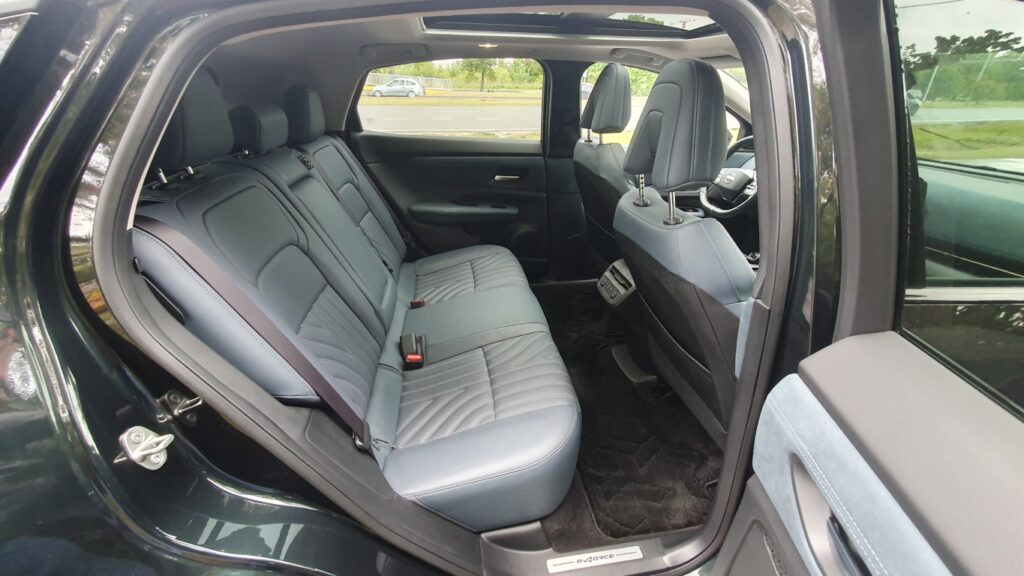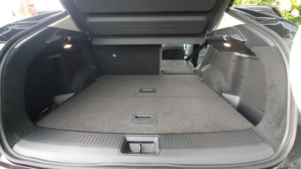 Bagażnik w Ariyi Evolve+ jest foremny i funkcjonalny. Można go otworzyć i zamknąć za pomocą gestu nogą, co bardzo ułatwia spakowanie się, gdy mamy zajęte ręce. Jego pojemność, jak na gabaryty auta jest dość skromna – 415 l, ale to też skutek zastosowania napędu na cztery koła. Po złożeniu oparć tylnej kanapy uzyskujemy 1218 l. Za to wersja e-4ORCE może holować przyczepę o macie całkowitej do 1,5 t.