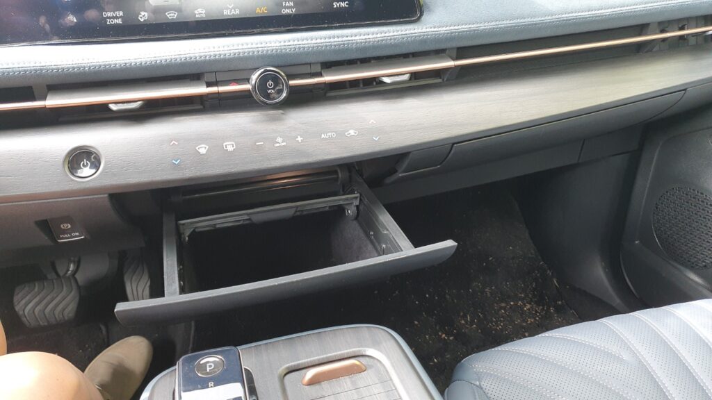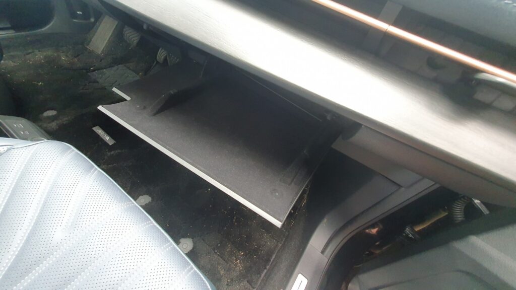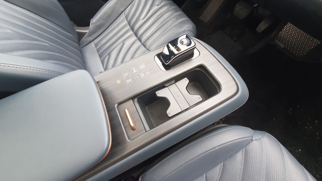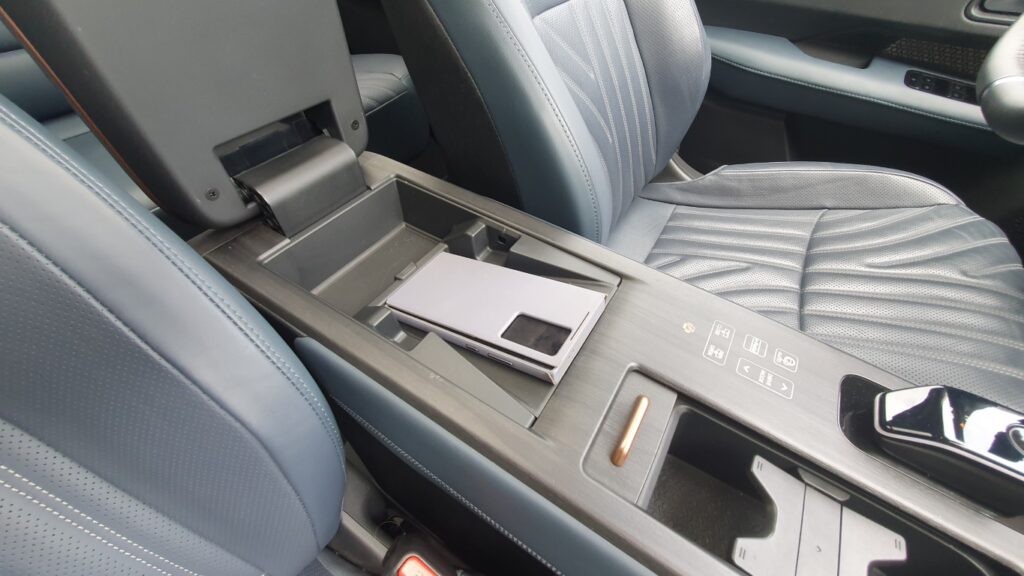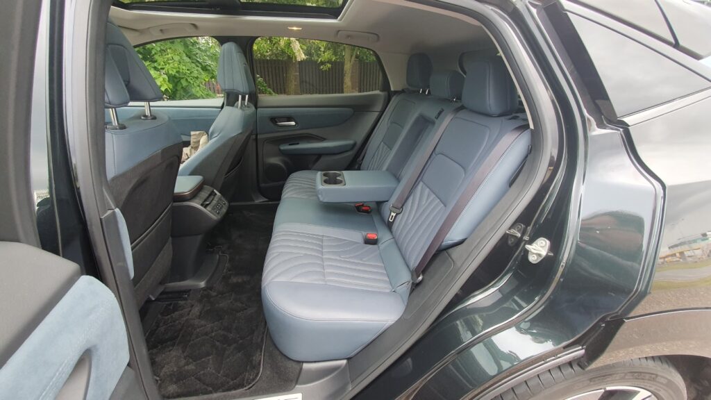 Wnętrze Ariyi robi bardzo dobre wrażenie. W testowej wersji Evolve+ zastosowano tapicerkę ze skóry Nappa w kolorze niebisko-szarym z elementami z alkantary. Materiały wykończeniowe są bardzo dobrej jakości. Wystrój jest futurystyczny, zaprojektowany ze smakiem. Konsola środkowa ma nowoczesną formę. Jest elektrycznie przesuwana, dzięki czemu można regulować sobie pozycję podłokietnika i schowków. Jednak podczas mojego testu okazało się, że jest na niej dla mnie za mało miejsca. Być może rozwiązaniem tego problemu byłoby wykorzystanie zamykanego schowka, który znajduje się centralnie po środku tablicy rozdzielczej pod ekranem multimediów. Obok przed pasażerem jest drugi, większy schowek.