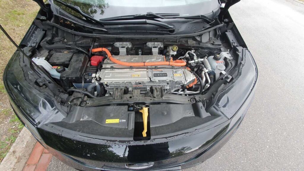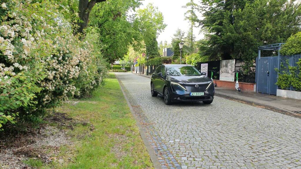 Mimo że Nissan Ariya to spore auto, w środku przy prędkości 140 km/h jest bardzo cicho. Podwójne klejone szyby oraz wykończenie wnętrza skutecznie odcinają od odgłosów z zewnątrz. Oczywiście to elektryk, ale opływ powietrza i toczenie się kół często przy wyższych prędkościach zakłócają sielankę. Tu jest cicho.