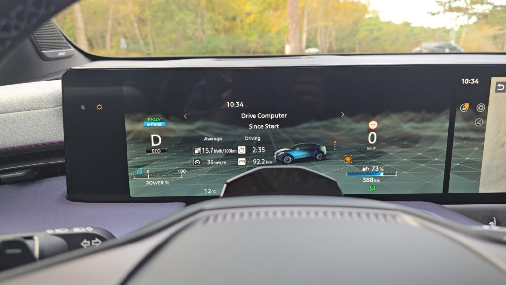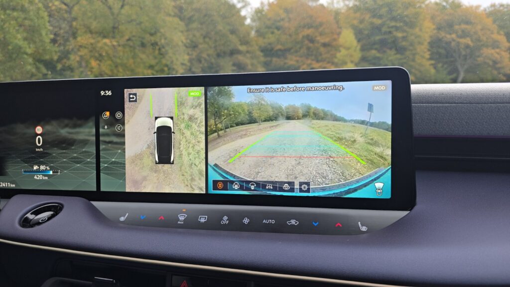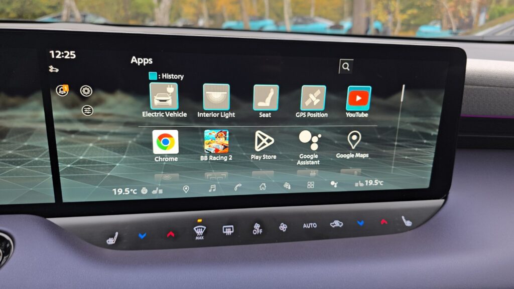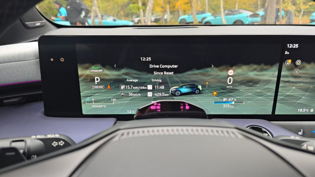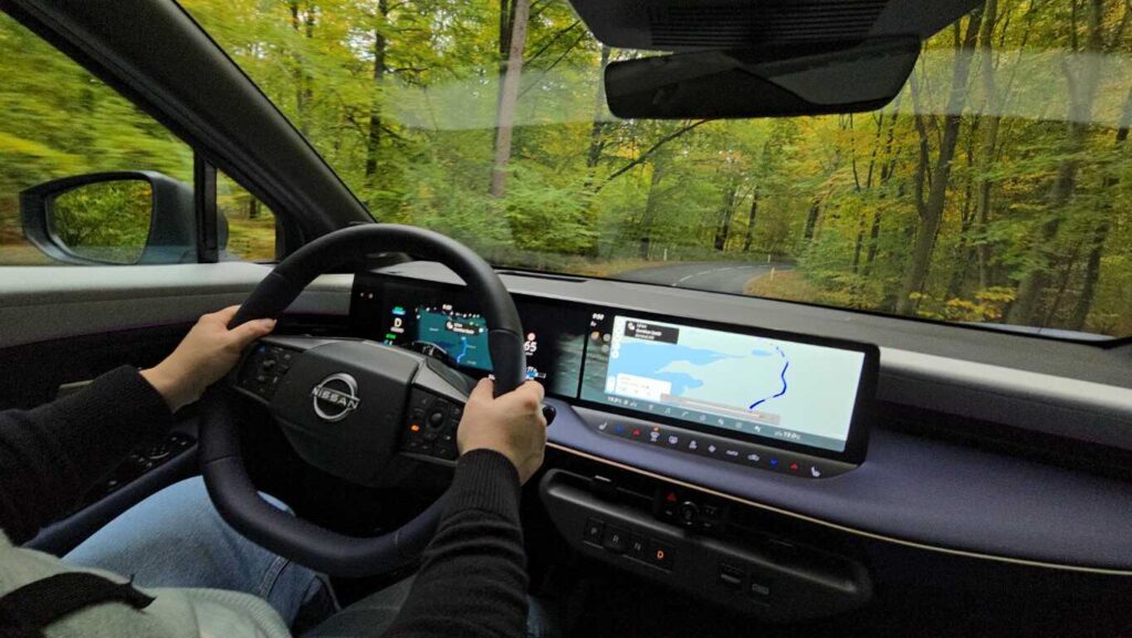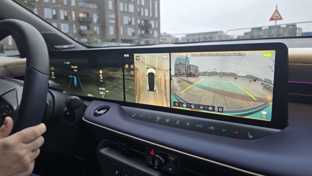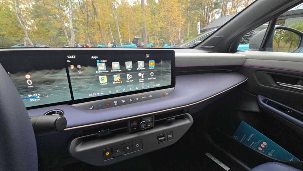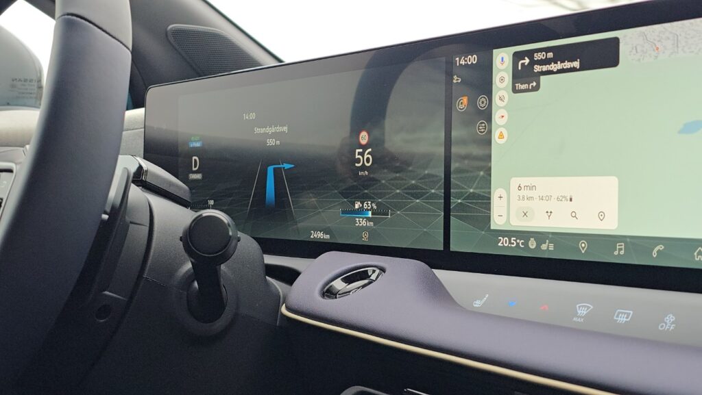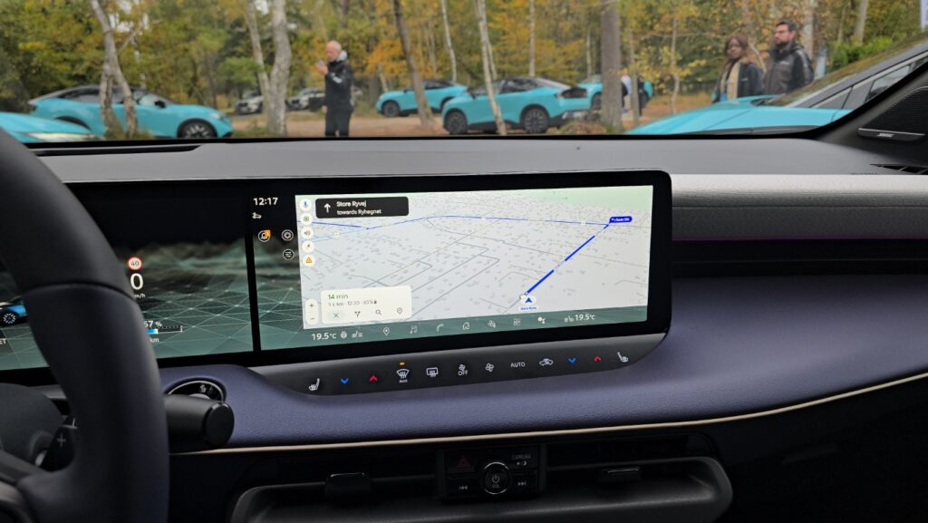 Całość dopełniają dwa ekrany o przekątnej 14,3 cala, które tworzą jednolitą listwę wyświetlaczy na kokpicie. System multimediów jest oparty na Google, więc po zalogowaniu na swoje konto można korzystać z aplikacji, które uprzyjemniają i ułatwiają podróż, w tym Google Maps. Za pomocą tej aplikacji można wyznaczyć trasę, która uwzględni postoje na ładowanie, wskazując też miejsca, w których można coś zjeść i odpocząć podczas podróży. Można też podłączyć bezprzewodowo telefon i korzystać z Apple CarPlay oraz Android Auto. System multimedialny jest intuicyjny i pozwala na szeroką personalizację.