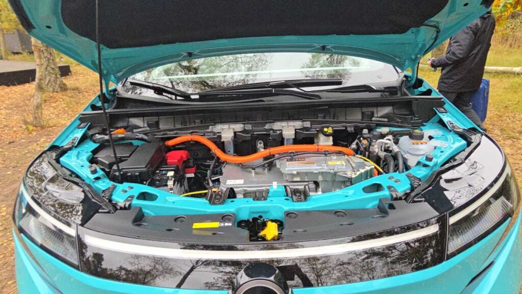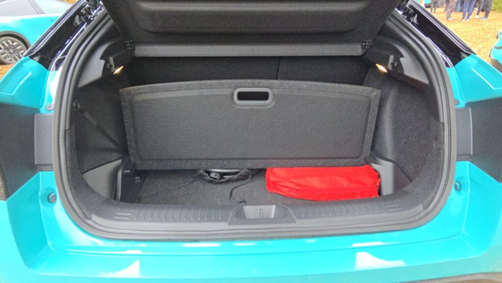 Bagażnik ma pojemność 436 l, ale po złożeniu oparć tylnej kanapy zwiększa się do 1176 l. Podwójna podłoga ukrywa schowek, gdzie można przewozić kable do ładowania i zestaw naprawczy. Elektrycznie otwierana tylna klapa ułatwia dostęp do przestrzeni ładunkowej. W tym wypadku pod maską nie udało się wygospodarować dodatkowej przestrzeni na schowek.