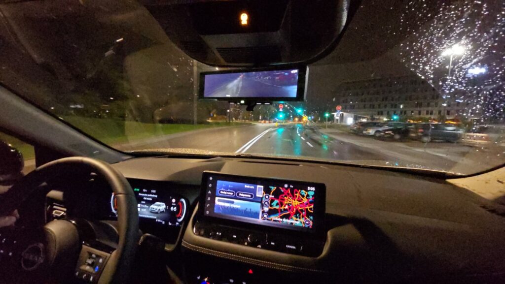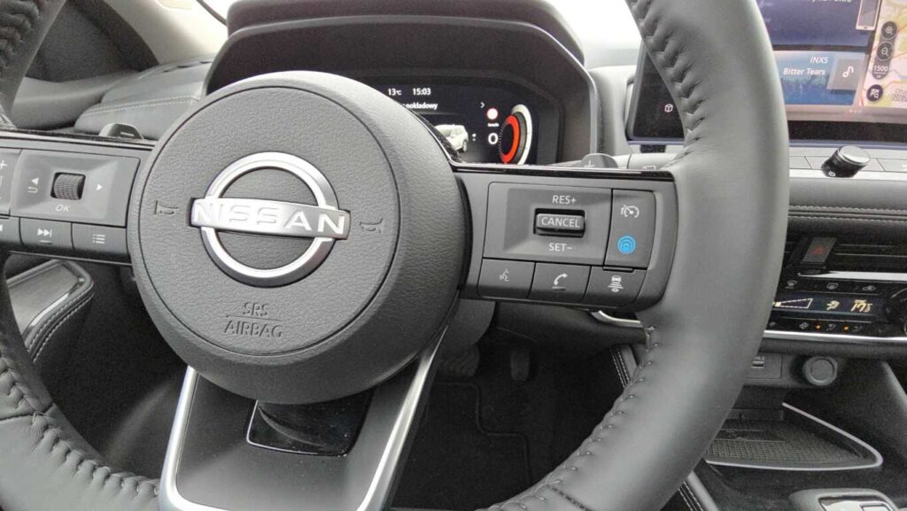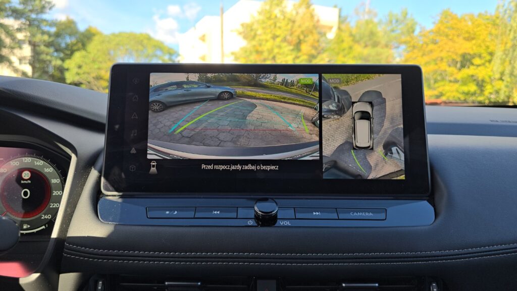 Wersja Tekna oferuje bogaty zestaw asystentów. ProPILOT Assist z adaptacyjnym tempomatem dostosowuje prędkość nie tylko do samochodów poprzedzających, ale też do znaków drogowych, rond, skrzyżowań i zakrętów. Aktywny asystent pasa ruchu koryguje tor jazdy i utrzymuje pojazd pośrodku, szybko jednak domaga się, żeby trzymać ręce na kierownicy. Jazdę ułatwiają też system monitorowania martwego pola z sygnalizacją w lusterkach, asystent cofania z hamowaniem przy ruchu poprzecznym oraz kamera 360°. Można też skorzystać z automatycznego parkowania, które pozwala zająć miejsce równolegle lub prostopadle. W praktyce systemy działają intuicyjnie, odciążając kierowcę. Szczególnie przydają się w długiej trasie i na ciasnych parkingach. Ich działanie można dostosować do własnych preferencji w menu komputera pokładowego.