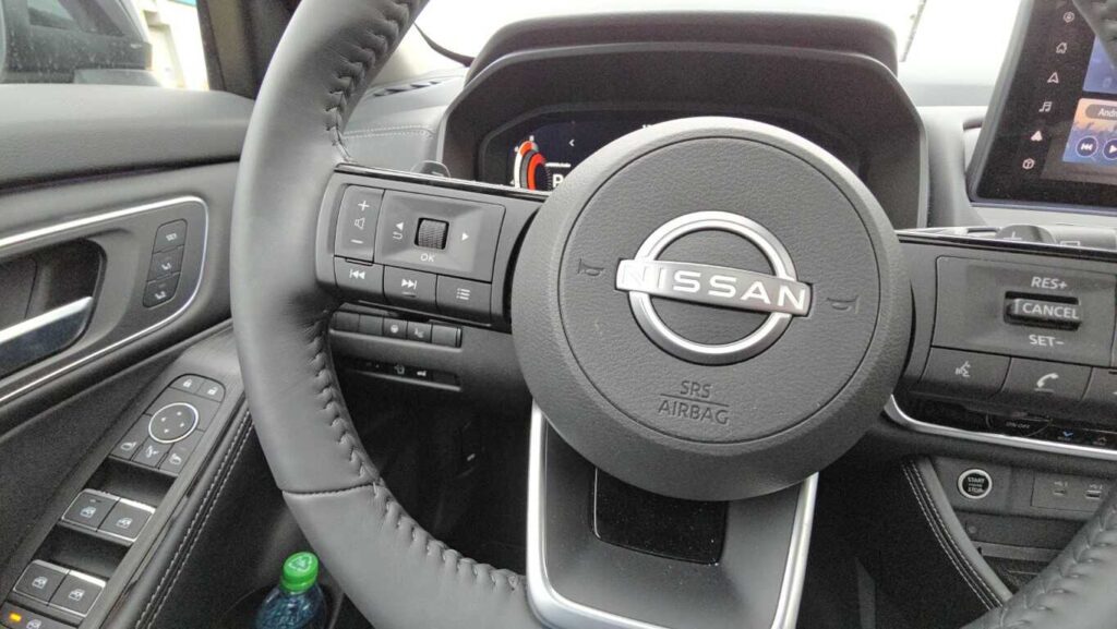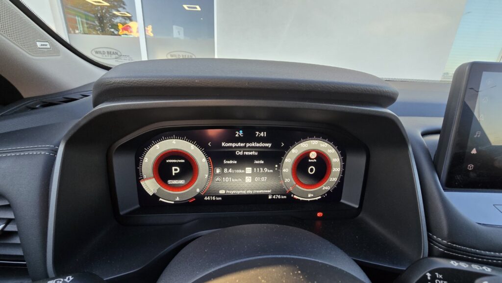 Dostępne są trzy tryby jazdy: eco, normalny i sportowy – przełączane przyciskiem przy dźwigni Xtronic. W trybie eco reakcja na gaz jest wyraźnie spowolniona, skrzynia trzyma niskie obroty, a miękka hybryda intensywnie wspiera system Stop-Start, co sprawdza się w ruchu miejskim. Tryb normalny zapewnia najbardziej naturalne zachowanie samochodu podczas jazdy. Przyspiesza on tak, jak tego oczekujemy. Sportowy tryb sprawia, że można tym autem jechać dynamiczniej. Pedał przyspieszenia reaguje szybciej, a skrzynia utrzymuje silnik na wyższych obrotach. Odbywa się to jednak kosztem głośniejszej pracy jednostki napędowej i wyższego zużycia paliwa.