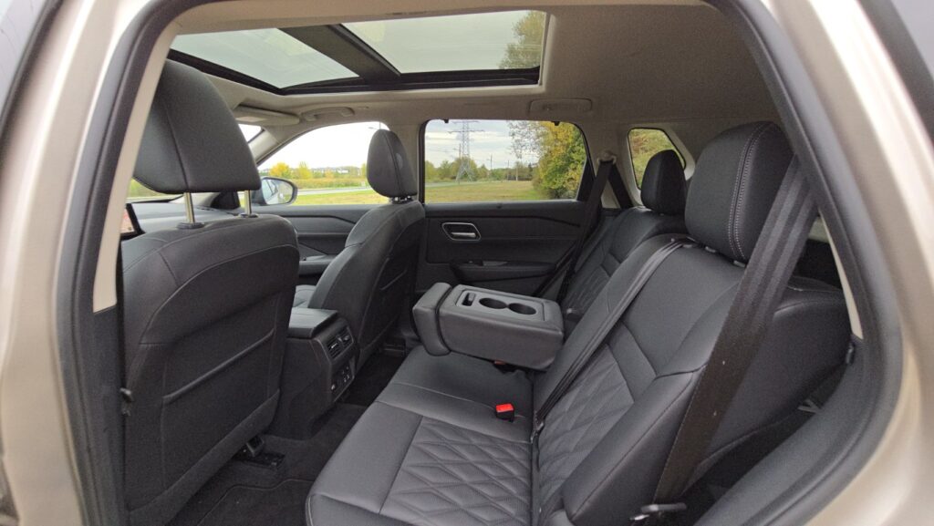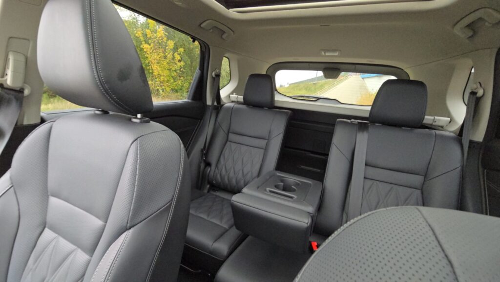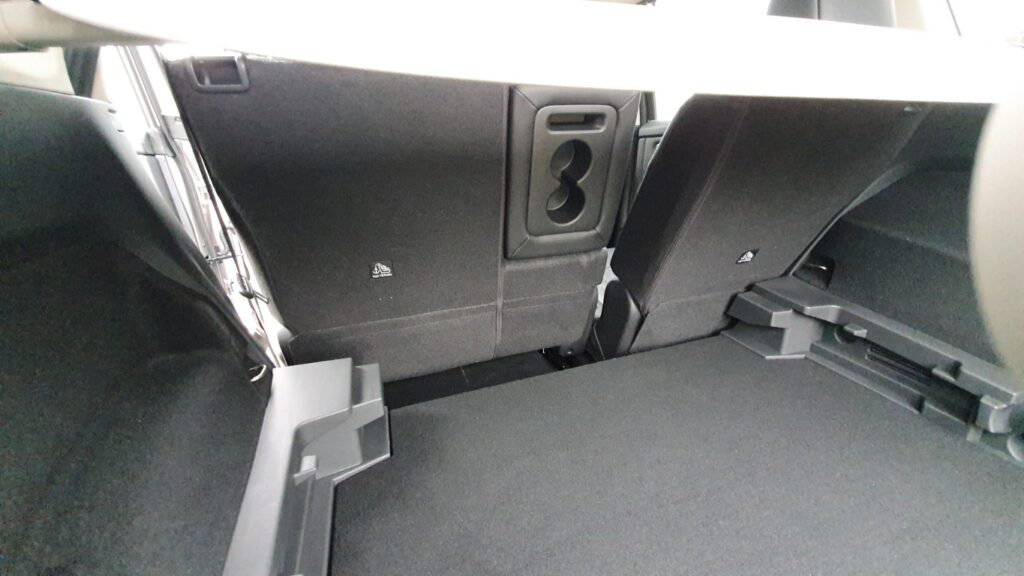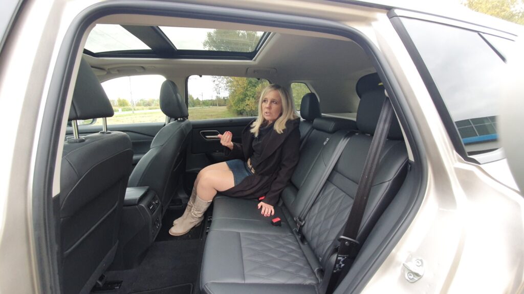 Tylne drzwi otwierają się pod kątem 90°, co znacznie ułatwia wsiadanie, ale również usadzanie dzieci w fotelikach. Z tyłu jest sporo miejsca. Pasażerowie dwóch skrajnych miejsc będą podróżować wygodnie, pasażer między nimi również ma nie najgorzej. Tunel jest szeroki, ale niski, co pozwala postawić na nim stopy. Siedzisko jest miękkie, oparcie dość twarde, samo miejsce wąskie, w sumie nie jest źle. Kanapa ma funkcję regulacji pochylenia oparcia i można ją przesunąć do przodu, powiększając w ten sposób bagażnik. Co ciekawe, nawet przy przesuniętej maksymalnie do przodu kanapie, nadal ktoś drobny i niewysoki może siedzieć z tyłu z prawej i lewej strony. Skrajne miejsca są dodatkowo podgrzewane. Podłokietnik jest szeroki, ma dwa miejsca na kubki i wnękę na smartfon. Gdy go rozłożymy, mamy też dostęp do bagażnika. Kieszenie w oparciach przednich foteli są głębokie.