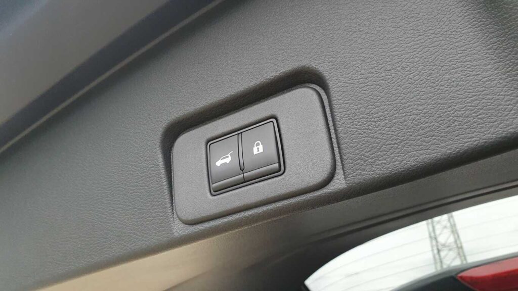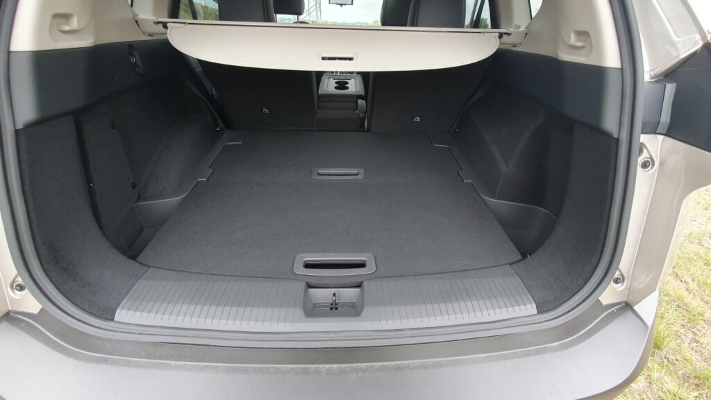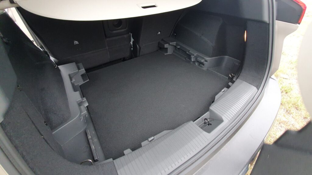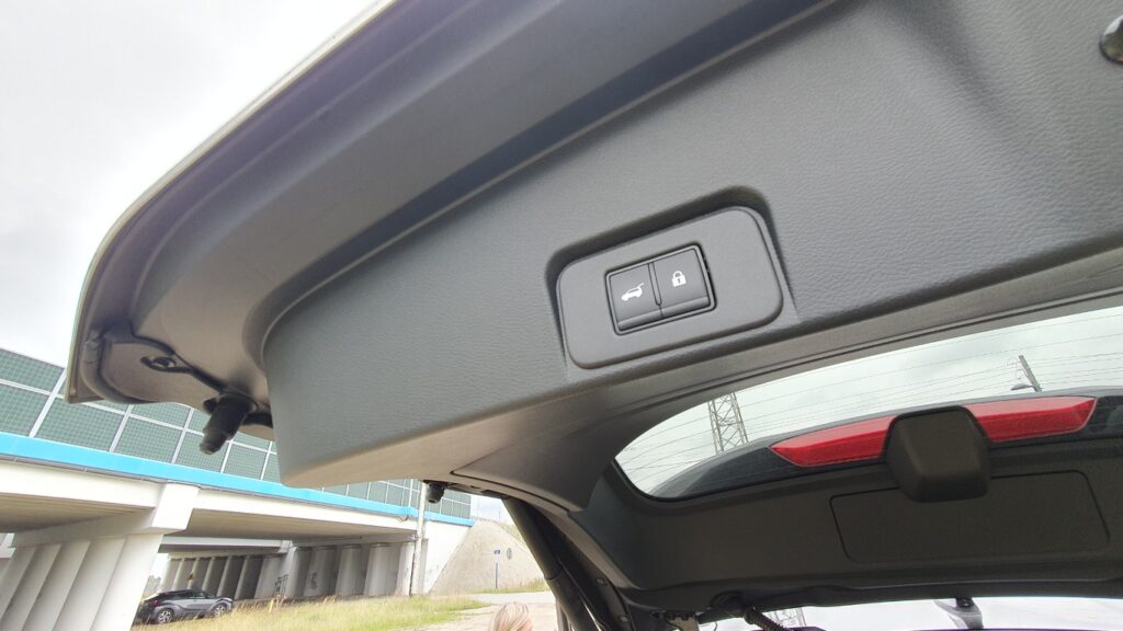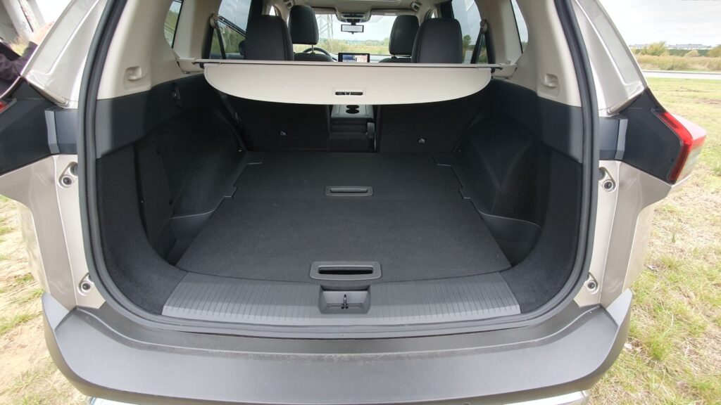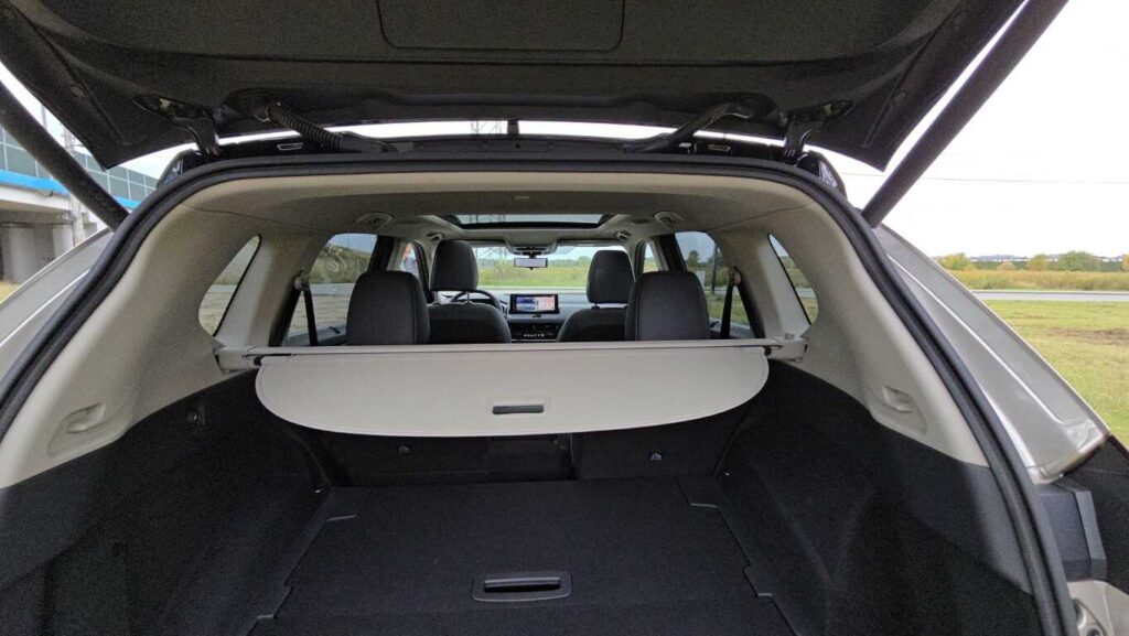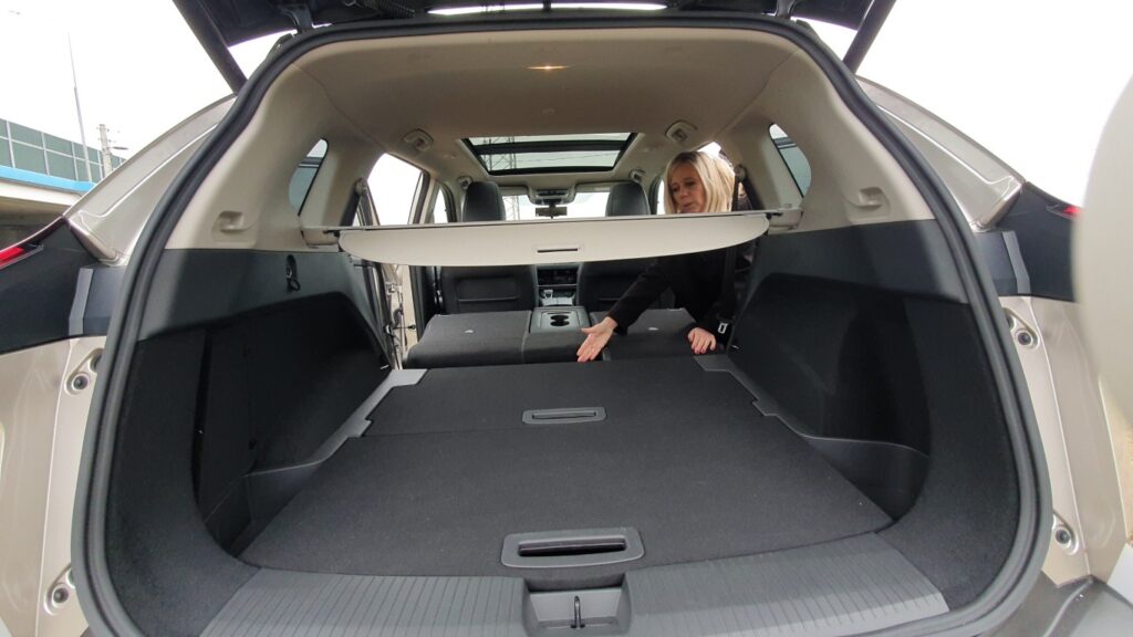 Bagażnik mieści 585 l (485 l z systemem Bose zajmującym miejsce pod podłogą), z podwójną, lekką podłogą dwustronną, gdzie z jednej strony jest wykładzina, a z drugiej gładkie tworzywo, łatwą do wyjęcia. Elektryczną klapę można otworzyć gestem, bezdotykowo. Zawartość bagażnika jest osłonięta roletą, w tym przypadku użyto jasnego materiału, co bardzo dobrze wygląda, ciekawe jednak czy będzie się brudziła na co dzień. W środku zastosowano cztery uchwyty do mocowania ładunku, gniazdo 12 V i tradycyjne oświetlenie. Pod podłogą obok nagłośnienia Bose jest miejsce na gaśnicę i zestaw naprawczy. Po złożeniu oparć tylnej kanapy do dyspozycji mamy ponad 1400 l i prawie płaską powierzchnię, z uskokiem przy kanapie przesuniętej do przodu.