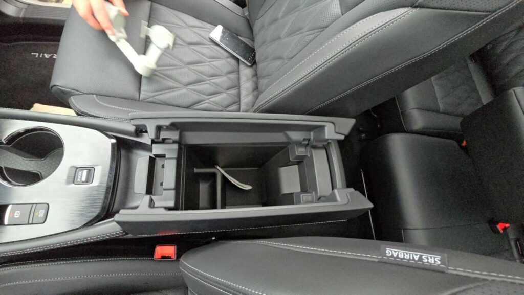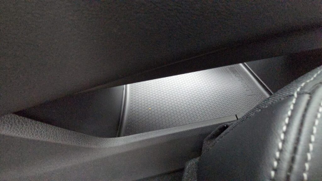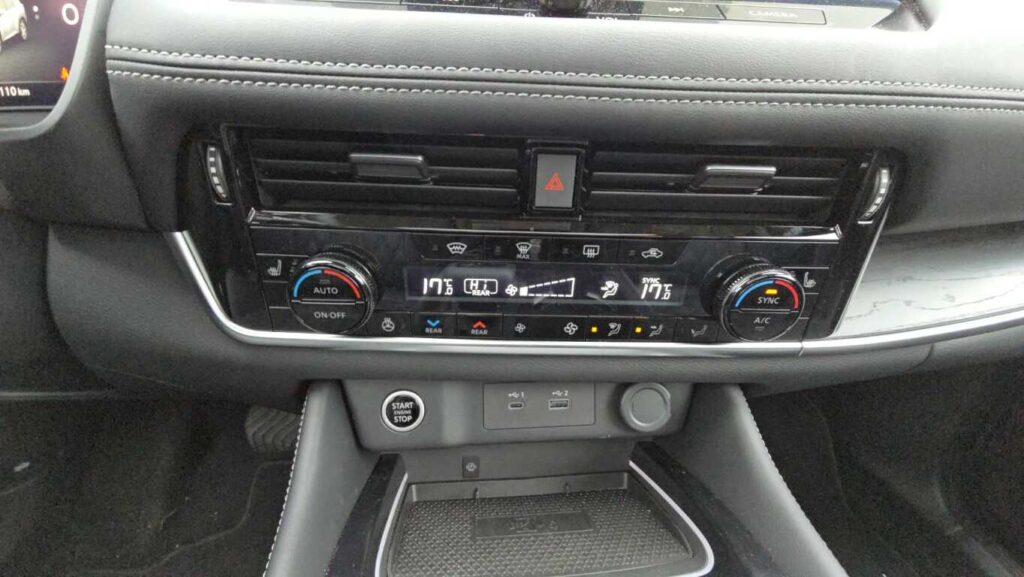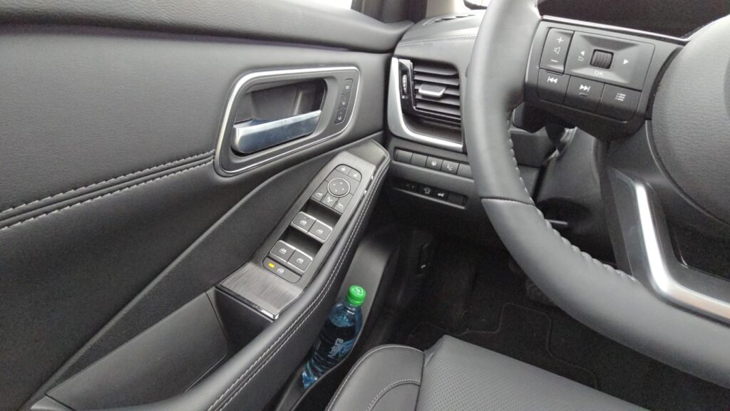 Zastosowane materiały w wersji wyposażenia Tekna robią dobre wrażenie. Głęboka czerń ekoskóry z białymi przeszyciami i perforacją, boczne wstawki imitujące drewno – bardzo dobrze wyglądają, a całość dopełniają miękkie okładziny. Trzystrefowa klimatyzacja sterowana pokrętłami oraz podgrzewane fotele i kierownica sprawiają, że podróż w każdych warunkach będzie komfortowa. Do dyspozycji są dwa gniazda USB (A i C) oraz gniazdo 12 V i indukcyjna ładowarka 15 W. W podłokietniku znajduje się spory schowek, otwierany na boki, dzięki czemu dostęp do niego jest łatwy z każdej strony. W drzwiach mieści się półlitrowa butelka, natomiast w schowku przed pasażerem nawet coś wielkości A4 na styk. Pod konsolą środkową jest otwarta półka z miejscem np. na telefon czy tablet.