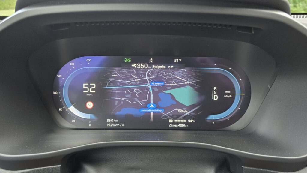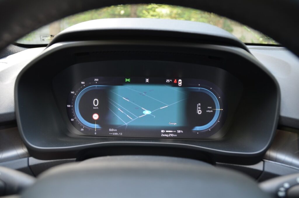 Przed kierowcą jest duży cyfrowy zestaw wskaźników o przekątnej 12 cali. Obok w konsoli środkowej 9-calowy ekran multimediów – jak na dzisiejsze czasy dość skromy, ale spełnia swoje zadnie. W tym przypadku, żeby korzystać z systemu Android nie trzeba podłączać telefonu. Multimedia są zintegrowane z usługą Google: Maps, Play i Assistant. Muszę przyznać, że Android Automotive działa bardzo dobrze. Nawigacja Google nigdy mnie nie zawiodła, a system audio Harman Kardon umilał tę długą podróż. Oczywiście za pomocą Google Maps można wyznaczyć trasę i zaplanować postój na ładowanie zgodnie z realnym, aktualnym zasięgiem.