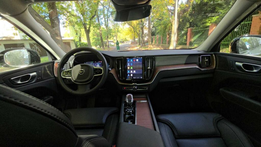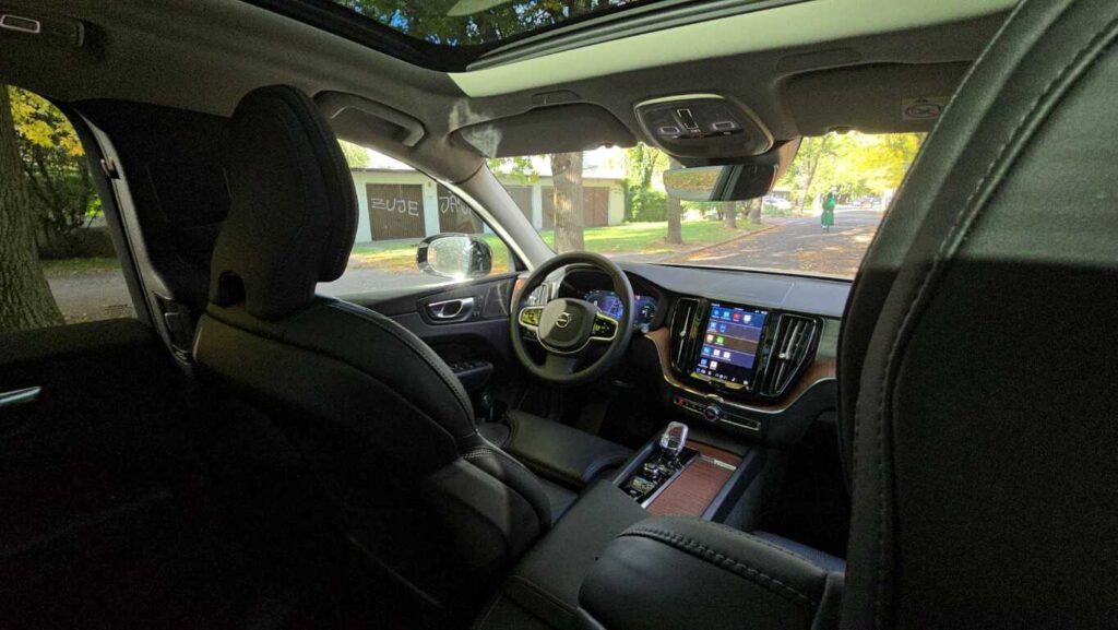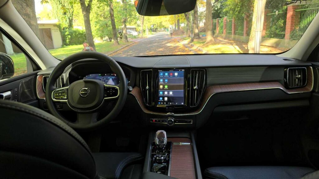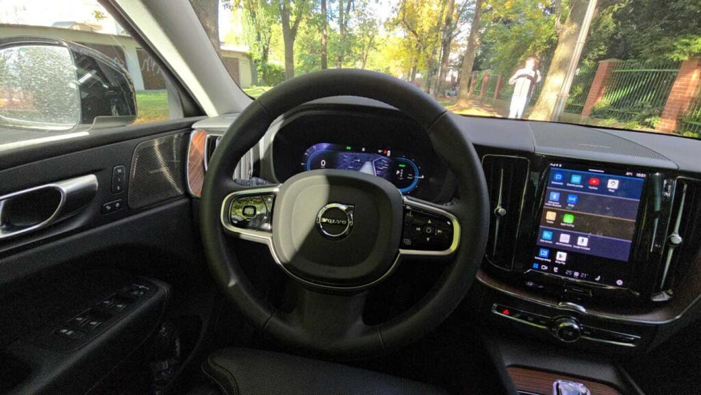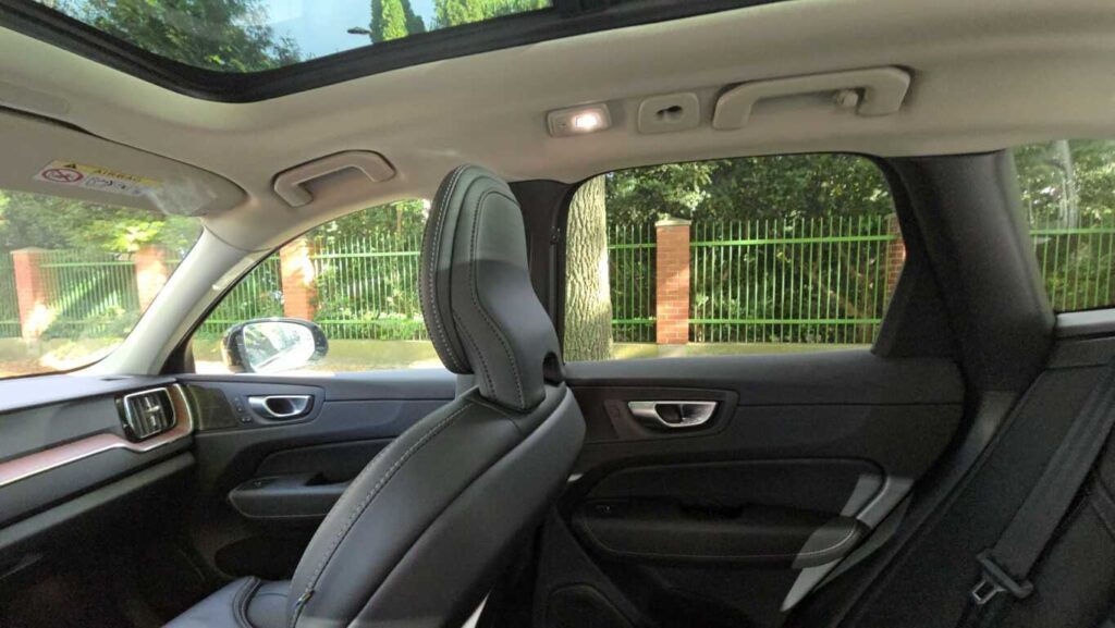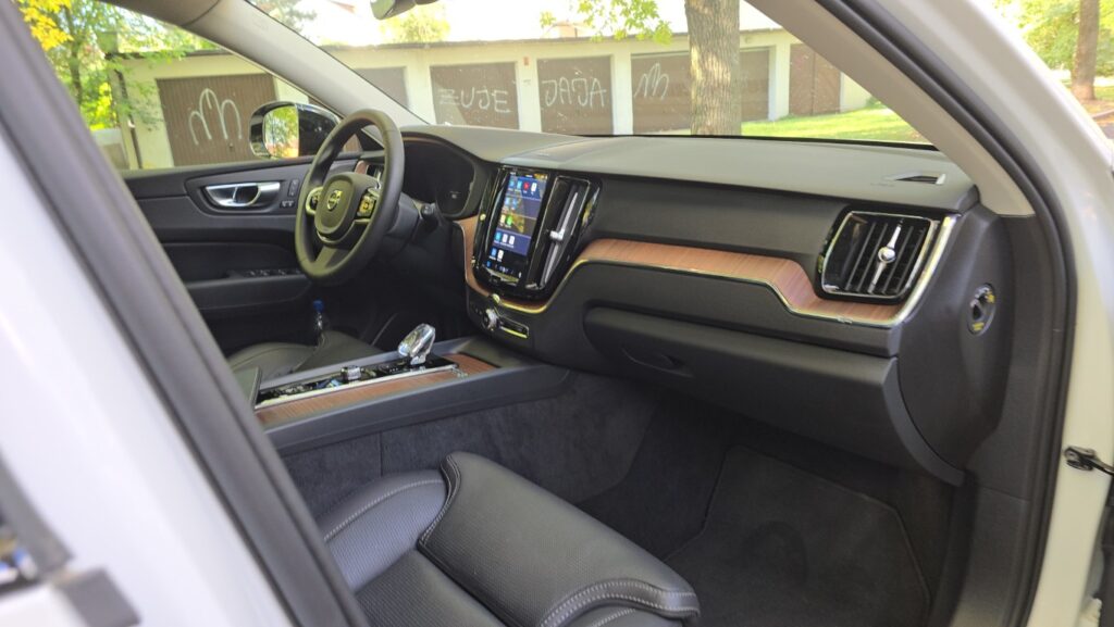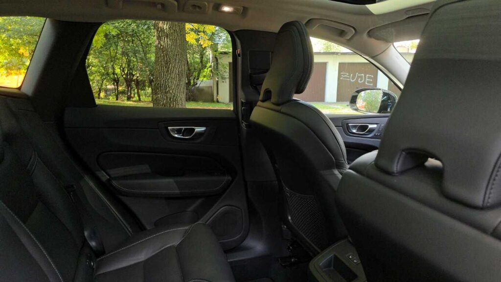 Wnętrze XC60 w wersji Plus jest bardzo dobrze wykończone: skórzane fotelach z przeszyciami, wentylowane i podgrzewane, drewniane i chromowane wstawki oraz tradycyjne szwedzkie akcenty. Fotel ma duży zakres regulacji. Zarówno wysokość, odległość od kierownicy, podparcie odcinka lędźwiowego, jak i podparcie boczne pozwalają precyzyjnie dopasować go do każdej sylwetki. Osobiste ustawienie można zaprogramować, co ułatwia zajmowanie miejsca za kierownicą przy zmianie kierowców. Są dwie możliwości zapisania ustawienia. Podłokietnik, mimo że nie jest przesuwany, znajduje się w dobrym miejscu niezależnie od postury kierowcy. Schowki w drzwiach są obszerne, podświetlany przed pasażerem wyłożono miękkim materiałem, a w konsoli centralnej można zakryć pojemniki roletkami. Telefon i inne urządzenia elektroniczne można ładować za pomocą gniazd USB typu C lub 12-voltowych. Jest też ładowarka indukcyjna.