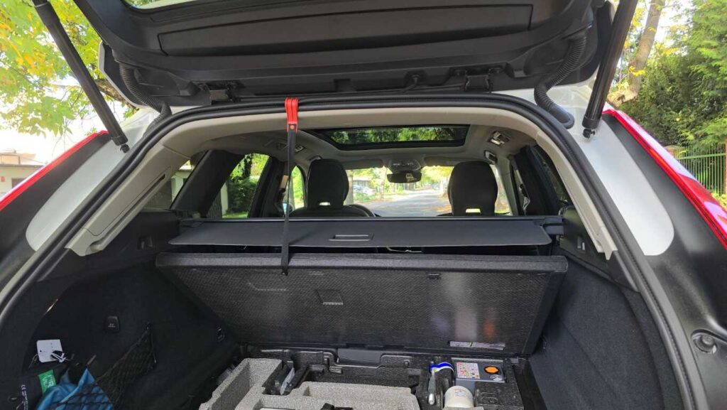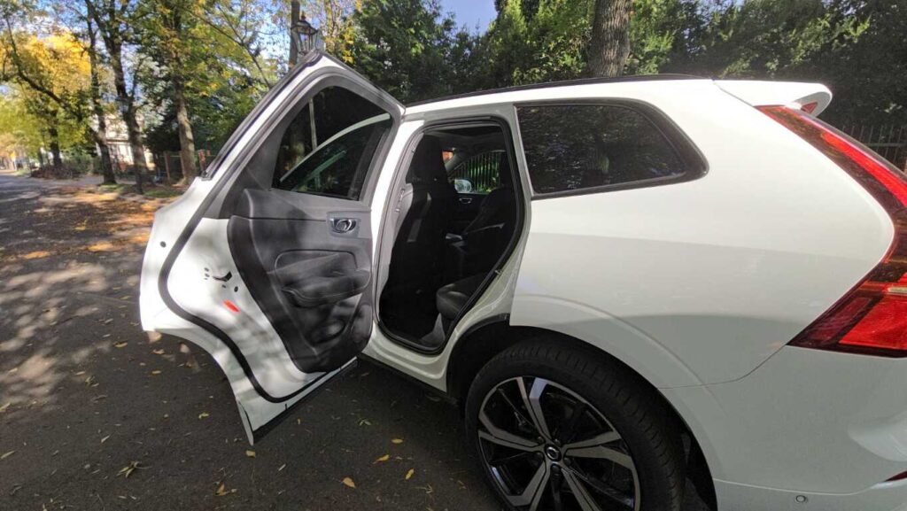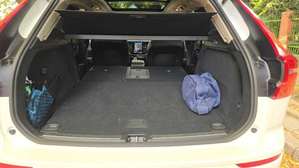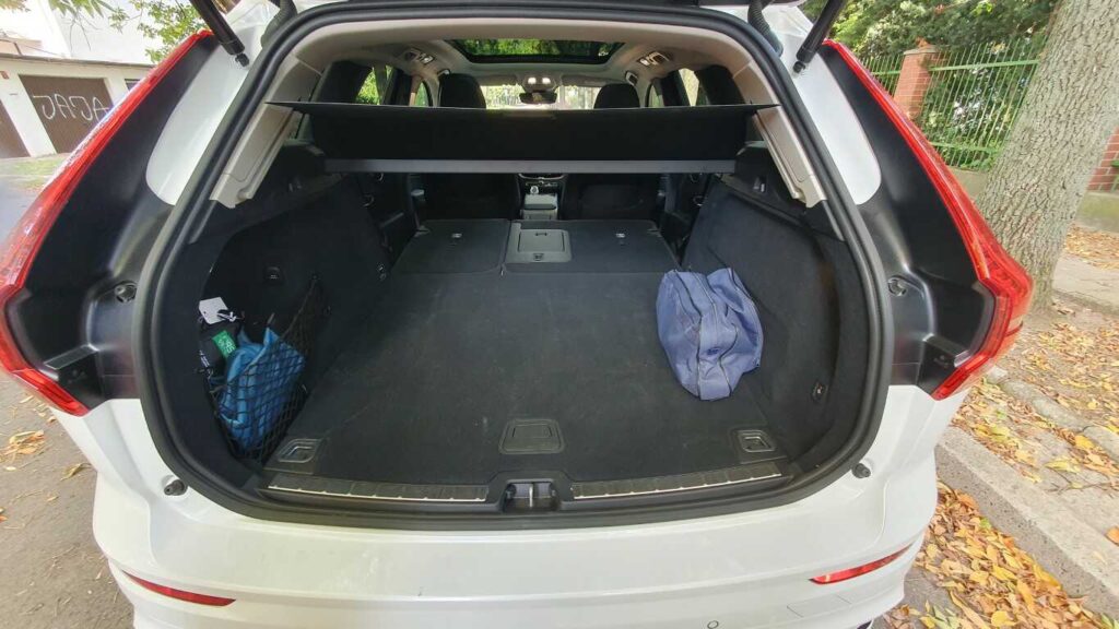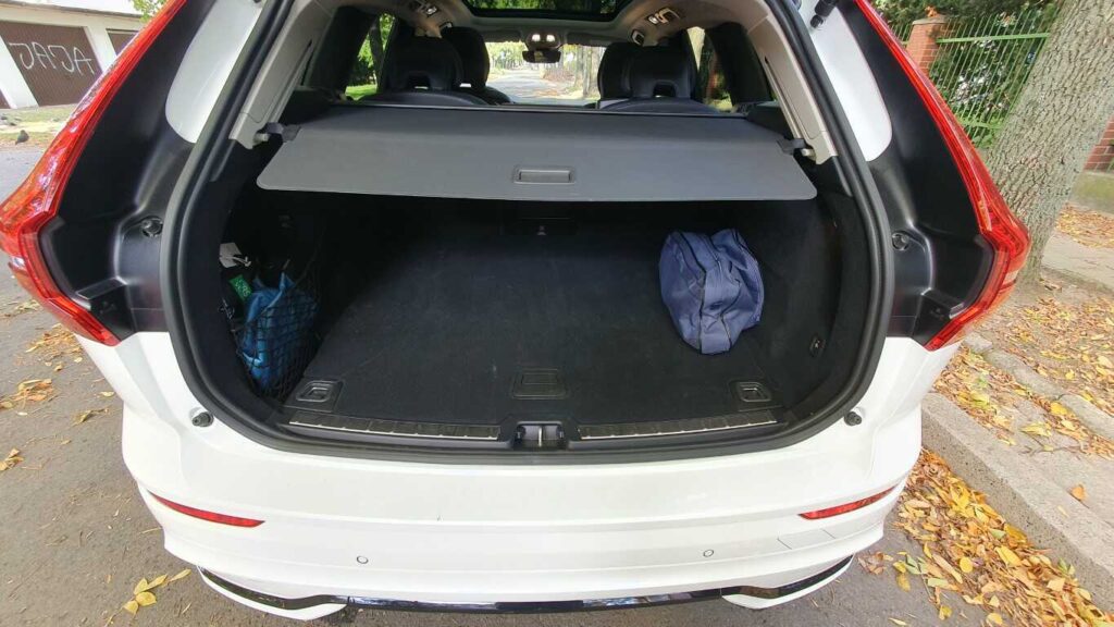Bagażnik Volvo XC60 Recharge to 468 l przy komplecie pasażerów. Wydaje się niewiele jak na tak duże auto, ale w środku jest sporo miejsca. Po złożeniu oparć kanapy z tyłu do dyspozycji mamy 1395 l i płaską podłogę. Roleta zabezpieczająca zakupy lub bagaż może być składana automatycznie, nie wymaga ręcznego zwijania. Klapa bagażnika jest sterowana elektrycznie, również gestem, co oznacza, że nawet gdy mamy zajęte ręce, sprawnie otworzymy i zapakujemy bagażnik.