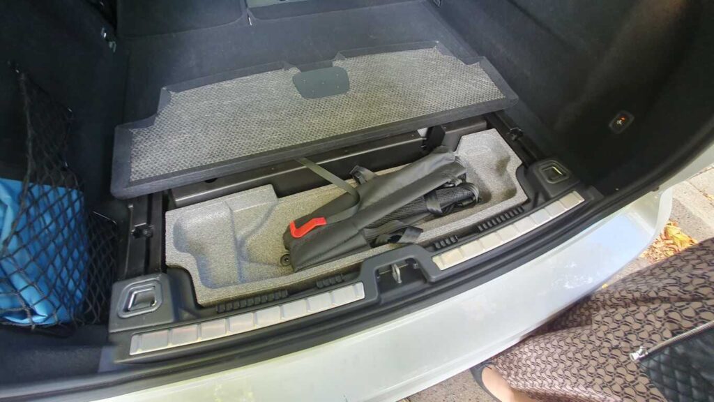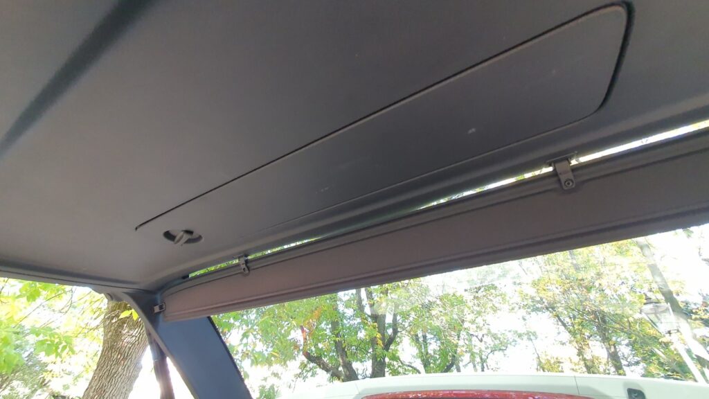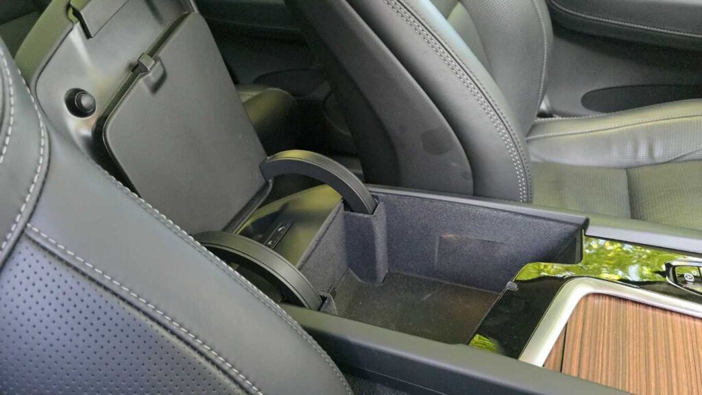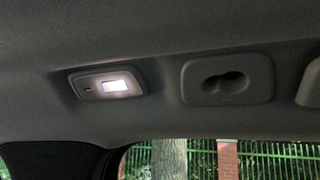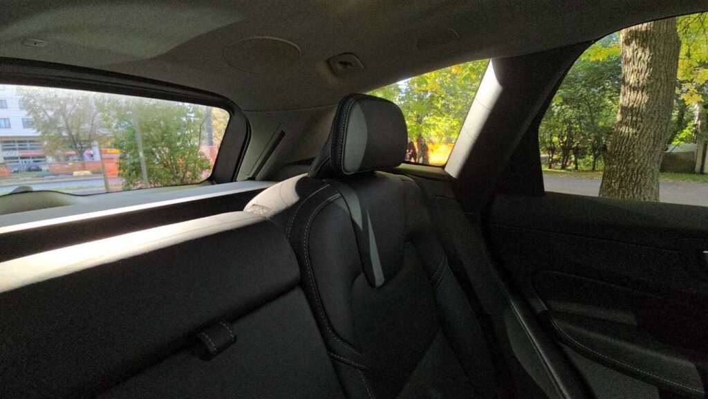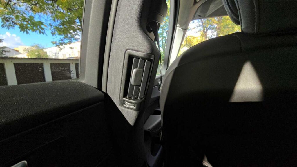 Pasażerowie z tyłu mają dość miejsca – zarówno na nogi, jak i głowę. Oparcie tylnej kanapy jest wysokie i wygodne. Środkowe miejsce jest mniej komfortowe: twarde i wąskie, a wysoki tunel ogranicza przestrzeń na nogi. Rozkładany podłokietnik ma uchwyty na kubki, które gdy nie są potrzebne, można złożyć. Na konsoli środkowej są przyciski ogrzewania skrajnych miejsc i dodatkowe gniazda USB typu C. Nawiewy umieszczono na słupkach B, co wydaje się trafionym rozwiązaniem.